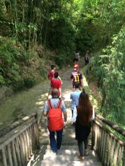 万州大瀑布随着近来旅游的开发升温而逐渐声名显赫,使得这个号称“亚洲的第一大瀑布” 吸引着越来越多人的兴趣。门票50元,买票进去了,沿着林荫中的青石板路经过大概10分钟左右的步行,就隐约的听到前面水声如吼,路边有着一条溪流,溪水奔腾而下,想必是瀑布下泄之水了。