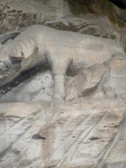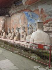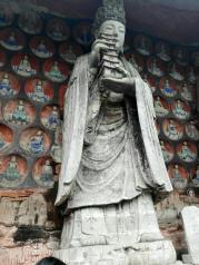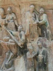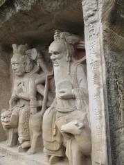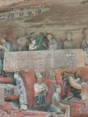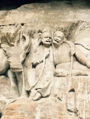 早就闻之大足石刻的艺术是我国的艺术宝库,有关石窟、石雕、石刻,在全国各地也参观了不少,但是,有相当一大部分的石刻讲的是民间的故事,大足石刻是绝无仅有的。 洛阳龙门石窟,显然是对武则天的歌功颂德之作,艺术水准是高,但是故事情节就无从谈起了。大同云冈石窟,绝大多数是天上的人物,对于我们人间的观众,很难在大同石窟中找到与自己类似的人物。 在陕西榆林红石峡石刻,地理环境极其类似,一进去就是右手石窟与雕刻,半圆地形也很类似,但是,大足石刻的地理环境没有榆林红石峡的开阔、壮观,红石峡是一条峡谷,之间是湍急的河水,一座大桥把两岸链接起来,巍巍壮观。在各个石窟之间还有引水暗渠,是一个多种类型的多学科的古迹,但
