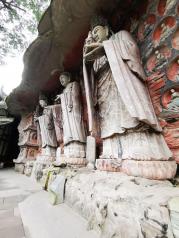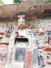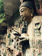 大足石刻堪与敦煌、云冈、龙门、麦积并称的艺术瑰宝,是南方最大也是艺术成就最高的石窟石刻群,以宝顶山为中心,以佛教造像为主,兼融儒道,所有造像都充满了艺术的灵动和连贯的故事趣味,风格独特,与其它石窟迥异。