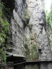 坐上景区观光车来到了龙水峡地缝。龙水峡地缝是全长4公里的泉水流瀑挂壁险峻幽深,怪石峥嵘,在武隆区仙女山镇境内。龙水峡地缝设有80米瀑布水帘,奇哉妙哉。地缝中老树藤萝盘绕,泉水流瀑挂壁险峻幽深,怪石峥嵘,明涧湍急。 龙水峡位于犹如地球上的一条裂缝,由几千万年前造山运动而形成的喀斯特地貌岩溶地质奇观。整个地缝景区,淙淙水声不绝于耳,有时响亮到压过说话声音。脚下悬空,下面就是奔腾不息的溪水,落差大,溪水流速很快,景区最窄处仅1米,游览线路全栈道设计。 这里有蛟龙寒窑。传说是因为内有蛟龙,龙水峡地缝因此得名。窄小的暗河在洞中奔流,轰鸣彻响。这里的石壁在常年流水的绿蚀下变得光滑无比。