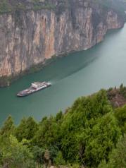 从高处观瞿塘峡的红叶,碧绿的长江蜿蜒于重山之中,尤如山间的小溪,江中的行船就只是个小点,高峡两岸,奇峰峻岭,漫山红叶,由山下蔓延到山尖,高山多彩森林,一草一木,彰显深秋瑰丽。