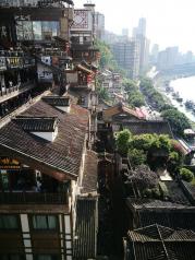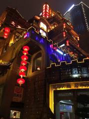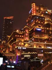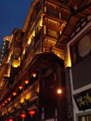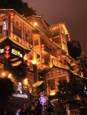 洪崖洞是逛山城老街、观赏两江风光、品尝当地美食的好去处。商业街位于渝中区沧白路,长江、嘉陵江两江交汇的滨江地带,以具有巴渝传统建筑特色的“吊脚楼”为主体,依山就势,沿江而建。 洪崖洞由纸盐河酒吧街、天成巷巴渝风情街、盛宴美食街及异域风情城市阳台四部分组成,以最具巴渝传统建筑特色的吊脚楼为主体,依山就势,通过分层筑台、吊脚、错叠、临崖等山地建筑手法,把这一片建筑汇聚在一起,夜晚时候灯火通明,堪称山城一景。 走进洪崖洞,两边都是密集的吊脚楼。从脚下的沿江路到顶层的沧白路有11层之多。隔层功能不同,有餐馆、有小吃街、有酒吧咖啡厅,也有土特产商铺。顶层既是异域风情城市阳台,可乘坐电梯直达。站在观景平台