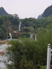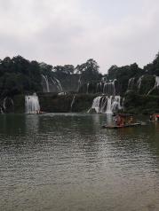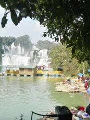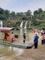 跨国德天瀑布非常著名的景点!只是我们来的时候还是旱季!水量不是很多!整个景点可以先坐竹排慢慢近距离观看!然后上岸了往中越边境的53号界碑!那里有小商品集市!再往回在栈道上观景平台有好几个!可以再从不同角度欣赏!