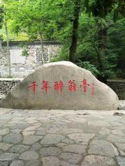 醉翁亭景区北大门进入后走一公里走三四百米可到,门口有李瑞环题写的千年醉翁亭红字石雕,整个醉翁亭景区有十来处景点,最经典的当然是醉翁亭这个亭子,验票进景区大门(虽然整个琅琊山景区是一张联票,包含了里面所含的各处景区,因此进入每个景区时无须再购二道门票,但进入每处景区还需扫二维码或打孔验票,比如醉翁亭景区就需要打孔),右手穿过一个圆形墙门就是醉翁亭