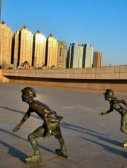 大连的广场星罗棋布,各具特色。广场给城市带来了很大的空间感,也给当地人带来更多的幸福感。星海广场,坐落在美丽的星海湾,是亚洲最大的城市广场。第一次是在晚上一睹她的华丽与妩媚。整个广场被灯光月光点燃,犹如梦境一般。第二次是临行前再次来访,想看看白日里的星海广场,更为真切。广场,面朝大海,背依繁华的都市,视野开阔,心境旷达。从广场中心南行,“百年城雕”如一本打开的书展现在眼前。印有各界人士的足迹浮雕,由北向南坚定而清晰,同城雕主体连接。海鸥,白鸽就在我们身边玩耍,飞翔。眼前的跨海大桥如绸带飘在眼前。