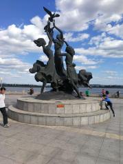 鸭绿江公园是游览鸭绿江两岸风光,尤其是中国一侧的城市建设,也可以看到原生态的朝鲜美丽风光,对面就是新义州,在我们这一侧,城市雕塑和园林建筑浑然一体。