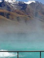 海拔最高的温泉——羊八井地热温泉。羊八井最美的时候是每天的清晨,由于空气比较冷,羊八井地热田一带总弥漫着白色雾气,地热田产生的巨大蒸汽团从湖面冒起,如人间仙境。如果运气好,碰上热水井喷发,更可一睹沸腾的温泉由泉眼直冲云霄的场面,十分壮丽美观。