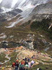 仙乃日神山(观世音菩萨)是亚丁三座神山之一,海拔6032米,在景区的北面,下面是珍珠海(卓玛拉措,3980米),看似观世音菩萨端坐莲花台上,她的怀中抱着一个巨大的佛塔(白度母),阳光照在仙乃日神山上会金光灿灿。从扎灌崩(3800m)走到仙乃日山下约2公里(海拔4080米),徒步来回约3个小时左右。从景区大门到扎灌崩(经过亚丁村)有景交车,路上约1小时。中间会在观景台停留10几分钟,给游客拍照
