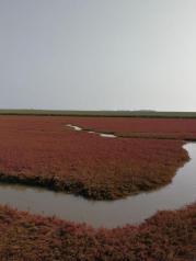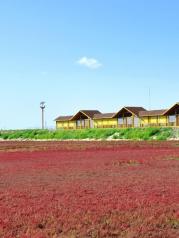 盘锦红海滩国家风景廊道位于辽宁省盘锦市大洼县赵圈河镇境内。第一次看到这样的红色海滩,其实是一种长在海边的红色碱蓬草组成,在其他地方没有见到过。红红的草、一片连着一片,去时可能不算很红,但看着也挺壮观的。景区内有专用观光车,私家车一律不得入内。马路两侧一边是红色海滩,一边是绿色稻田,对比强烈,非常有特色。不过听朋友说,面积比以前有所减少了,真是美景不等人呀!没看过的要抓紧了。 游玩Tips: 1、景区是有季节性的,每年的5月开始对外开放,十月中上旬为生长最旺盛期,也是人最多的。 2、金秋季节,河蟹和大米都是当地特产。