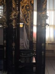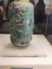 刘氏庄园博物馆从建筑学的角度,宅子确实建的很讲究,精雕细琢,用足了功夫,斑驳的油彩快脱落了。宅子气势恢弘,搁在现代也是土豪呀。银丝盘子很精美,还有镶了宝石的椅子保存很好。