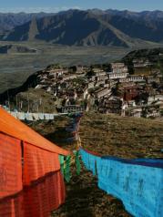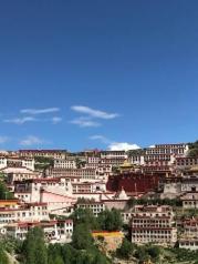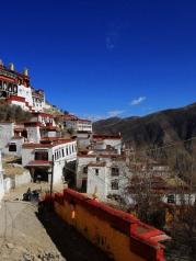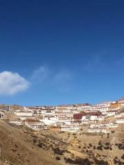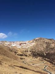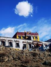 到了甘丹寺后,可以先拍下全景。当地藏民到达甘丹寺后,一部分人选择一条偏上,路有点烂的路走--开始我们也疑惑,后来其他人告诉我们,他们是要转山;另一部分人选择平着直走,走的石板路/水泥路---这是到寺庙的线路。个人觉得作为游客,选择寺庙线路即可。