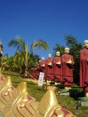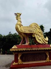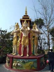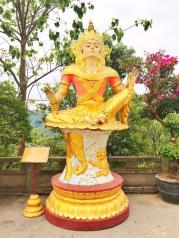 勐焕大金塔殿内有很多佛像,殿外有个很大的卧佛,披着金色袈裟,面目和善,闭目养神。 殿外的旗杆也十分高大,底座饰以龙纹。 殿外还有很多神像,如三戒神像,“非礼勿视,非礼勿言,非礼勿听”。 还有和谐神像和恒河女神像,神态各异,惟妙惟肖。