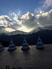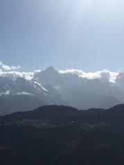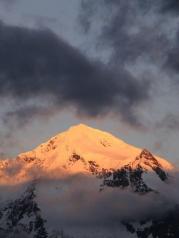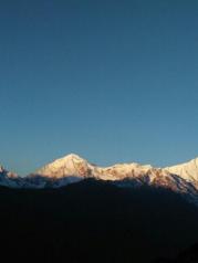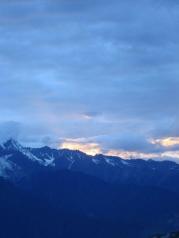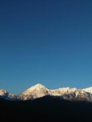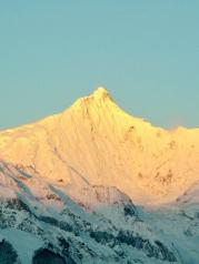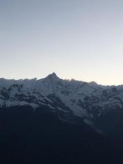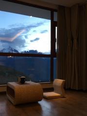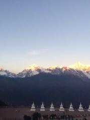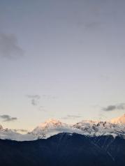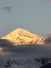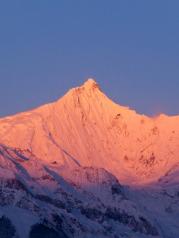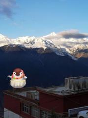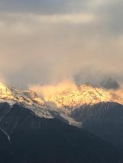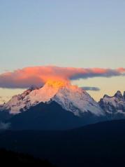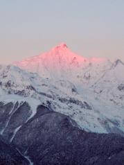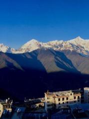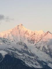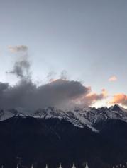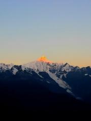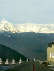 梅里雪山——酒店五层天台正对卡瓦博格,无障碍。在阳台观赏亦是,非常棒。在房间阳台等候日照金山, 今天运气太好了,早晨8点左右,太阳出来美如画,梅里雪山峰似金。