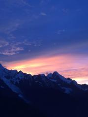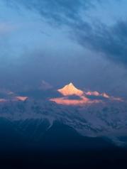 梅里雪山太壮观了,连绵十几座山峰构筑了一幅巨大的雪山画面。有幸在太阳落山前赶到了飞来寺,拍到了美丽的晚霞。原计划第二天一早起来拍日照金山,但由于高反,当天夜里翻来覆去睡不着,到凌晨3点才昏昏入睡。等第二天爬起,太阳早已升得老高的了……哎,蓝瘦香菇……