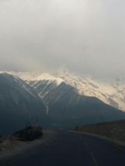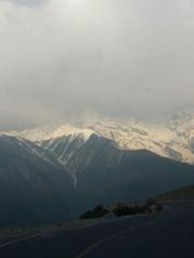 盘山公路爬上来是白马雪山,可以看见正面的一座山上还有一些白雪。上午在奔子栏,警察设卡拦车并告之白马雪山由于大风雪需封山,任何车辆不得通行,中午在东竹林寺附近再有警察设卡,但这回却说白马雪山可上,前提是必须四驱车或上防滑链的车才能上山,而且须司机签名画押并留联络方式……感觉像签生死状,呵呵。 冒着风雪自驾翻越白马雪山,顶着凛冽寒雪、面对泥浆包裹的车轮装载、拆卸汽车防滑链……路边全是悬崖峭壁,风雪令能见度下降至不足百米,全程50公里盘山路开了将近4小时……弯多路滑、步步惊心,到达雪山垭口海拔4292激动不已,一起经历艰辛路程的感觉就是同生死共命运! 翻越雪山抵达德钦县城,穿过该城往飞来寺方向行驶约