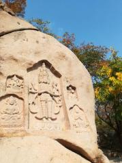 十一先到北镇双塔、阜新海棠山、朝阳化石谷、最后参观锦州博物馆,一路上高速畅通,游人不多,食宿价格适宜,真心推荐! 海棠山被誉为“佛教艺术名山",山上的摩崖石刻随处可见、轮廓清晰,在婆娑树影的映衬下尽显密宗特色;山顶远眺层林尽染、黄绿相间的树叶夹杂着点点艳红,好一派醉人的秋之韵!树上的小松鼠欢快地跳跃着、捧着松塔啃个不停…… 何必去扎堆呢!