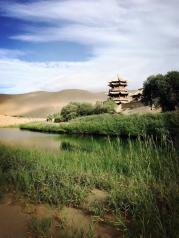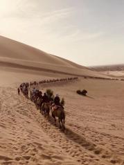第一次见到敦煌鸣沙山连绵的沙漠,很是激动。细细的黄沙在太阳出来后是那样的闪亮。月牙泉为这沙漠注入了活力。骑着骆驼,组成驼队。我仿佛穿越时空,成了古丝路上的商人。