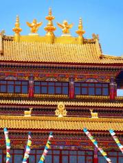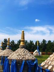 乌兰活佛府,静谧的佛学院,远观是静土,天空湛蓝湛蓝的,五色旗杆让人肃然起敬,建筑恢宏还高大上。进入后,大开眼界,墙壁上精雕细刻,房廊金壁辉煌,连座椅都极用心。