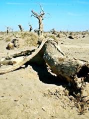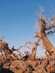怪树林是摄影师的拍照天堂,也是倒地胡杨千年不朽的地方。由于河道的改变,让这里上千亩的胡杨林枯死,形成千姿百态的枯枝干,这些千年不倒的树干,在风中凌冽,形成各种各样的形状,有一种悲壮又震撼的感觉,随手一拍都是大片。