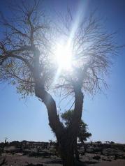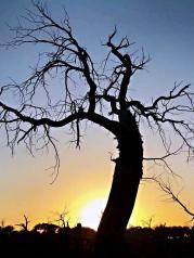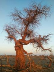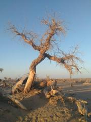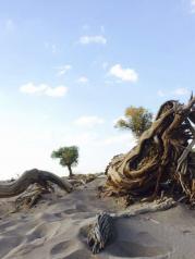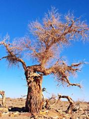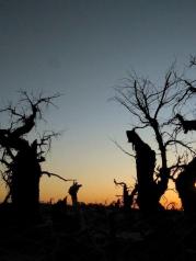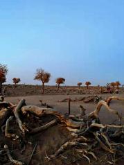 怪树林位于额济纳旗西南,因黑河上游无度用水,造成下游地下水位下降,达2000亩枯死的胡杨“陈尸”遍野,枯木凄惨怪状,被当地称为胡杨的坟墓。其本身耐腐蚀的特点,让它以最原始的风貌直立在戈壁沙漠中。经过国家大量的投资治理,居延绿洲逐渐恢复生机,大片死去的胡杨林长出了许多新枝。哀叹胡杨的远去也许更应该哀叹人类自己,拯救胡杨林便是拯救人类自己的家园。