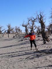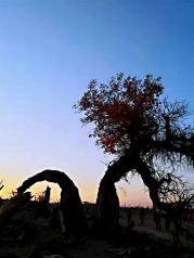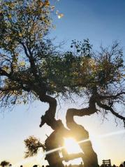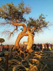 从酒泉一早坐大巴车下午到的额济纳胡杨林,跟同住一酒店的两人包车去的,一共两百(都是这个价),三点多到了排很长队进去景区大巴,说赶在夕阳下山时在怪树林拍的景色最美,因排队太久,到了太阳已落山,不过不影响它的美,奇形怪状的胡杨倒而不腐一千年,很美,有的叫“生离死别”有的叫“生死相依”还有很多很多……