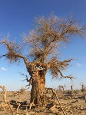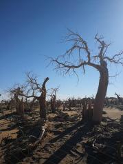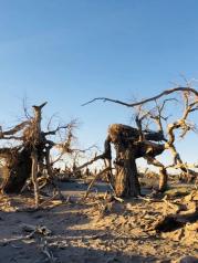 额济纳胡杨林由于水源不足,胡杨树木枯死,枯木惨状凄凉。生而千年不死,死而千年不倒,倒而千年不朽。