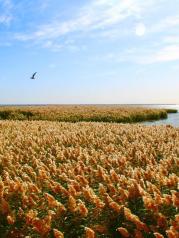 居延海是我国第二大内陆河黑河的尾闾湖,形状弯曲犹如新月,额济纳河汇入湖中,是居延海最主要的补给水源。居延海是一个奇特的游移湖,它的位置忽东忽西,忽南忽北,湖面时大时小,时时变化着,“居延”是西夏语,为“流动的沙漠”之意。