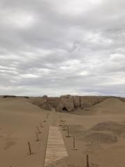 我去额济纳胡杨林的时候只收了门票费,没有景区内大巴了,需要自己开车进去。这也没办法,栈道都被沙子给淹没了,怪树林很大一片,在这里你能感受到生命力的顽强。尽头是黑城遗址,是目前古丝绸之路上现存最完整、规模最宏大的一座古城遗址。真的很大,当然不能和现在的城市来做比较,当时人口和现在是人口不能比,大小和大学差不多。遗址城墙禁止攀登的,周围很多摄像头,你走哪儿它跟哪儿,哈哈哈哈……莫名的紧张感 话说回来……为什么我去沙漠一次,又遇到暴雨一次?想滑个沙都不行?!