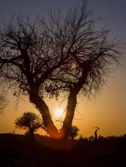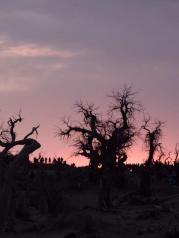 去额济纳怪树林看日落的人多的不得了!稍微有点说法的树前都围满了游客。太阳高高挂在西天,很多人就登上山岗,在那里等候。我个人觉得在怪树林观落日还是在树林中更好,在高处只能看到太阳西下,其余的景色因光线渐暗,什么也拍不到。事后,开车师傅就很后悔,他就在山头上。而我在树林中,不仅有很美的日落,还捕获了很多夕阳下的枯木树影,还有暮色中的半个月亮挂树梢。
