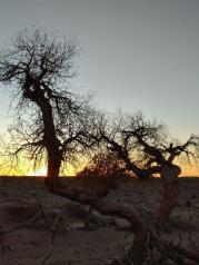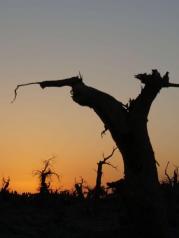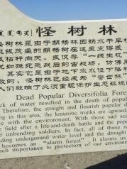 下午逛逛额济纳怪树林,胡杨是一种奇特的树种,生命力极强。胡杨赖以生存的生态环境、特别是额济纳河断流,沿河两岸的大片胡杨林因缺水而枯死。胡杨特有的耐腐特性,使大片枯死的胡杨树干依然直立在戈壁荒漠之上,形成形态怪异的悲凉景观