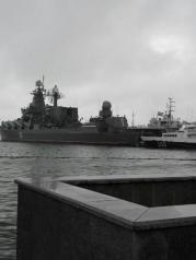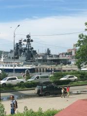 【海参崴C-56潜水艇博物馆】海参崴必去的景点。这艘潜艇是一艘功勋潜艇,在二战期间功勋卓著,击沉十四艘轴心国舰船。有三个舱室还基本保持原貌,潜望镜、操控台和鱼雷还按原貌陈列。其它舱室则改为博物馆,陈列着苏联潜艇的发展历程和本艘艇的功勋历史。前面的海港中就可以看到太平洋舰队的现役军舰。右边则是太平洋舰队司令部所在,大楼其貌不扬,但门口的卫兵和楼后山上的雷达天线和装甲突显出其军事功能。后面则有尼古拉凯旋门,很雄伟!