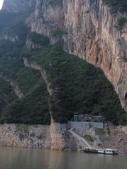 瞿塘峡是三峡的第二个峡谷,由于是枯水季节,江面上有一节裸露的岩石。两边的山峰高低错落有致,非常的险峻。这么陡峭的山峰,还有建筑,不得不佩服人类的伟大。
