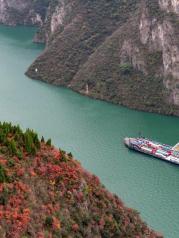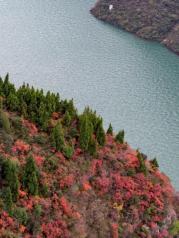 从高处观瞿塘峡的红叶,碧绿的长江蜿蜒于重山之中, 尤如山间的小溪,江中的行船就只是个小点,高峡两岸,奇峰峻岭,漫山红叶,由山下蔓延到山尖,高山多彩森林,一草一木,彰显深秋瑰丽。
