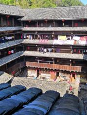 南靖的和贵楼有点意思哦。它是在几千平米的沼泽地里建造起来的,为什么呢?因为这是风水宝地!简氏家族在繁衍上都是男孩,其中有一位考上了进士,在和贵楼大门旁立这一旗杆,杆头的形状貌似一毛笔的笔头,意为考上的是文官!这楼前后有山,也是风水之说!进楼中庭有一块石头铺的,你跳上去,它会渗水会颤动,你们可以猜猜它是怎么建造的?楼里两侧有两口井,左侧是阴阳井,非常清澈。而相隔几米就是一口污井,非常浑浊!这很奇特哦!所以这两口井一口吃食用,一口消防用!值得一看!