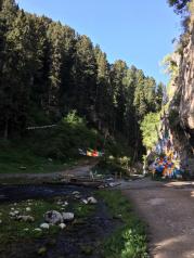 本人觉得郎木寺的风景比拉卜楞寺好,尤其是四川那边寺庙的风光特别好,四川这边管的松,你买不买票全凭自觉,有个大门,门口旁边有个售票处,你不买也没人拦你,我们自觉的买了票,30一个人,我们开车直接能上去到肉身殿,进殿有喇嘛给介绍哪个是肉身佛,这里的喇嘛要给个赞!比拉卜楞寺的喇嘛和善多了,出了肉身殿接着往上走一段就能看见仙女洞了,一定要进去看看,我是跟着一拨藏民进去的,他们告诉我应该怎么祈福,要摸哪块石头,都非常和善!我们下山又去了对面甘肃的郎木寺,这边的门口管的严,必须买票还要买5块停车费,两边差别真大!甘肃这边我们简单的转了转就直奔后山的天葬台了,这边有名的就是这个了,顺着当地藏民指路到了太葬台