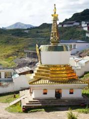 在郎木寺沟里有两个隔河相望的寺庙:一座是四川的达仓郎木格尔底寺,另一座是甘肃的赛赤寺。而我们去的是四川的达仓郎木格尔底寺。白水河在郎木寺镇流过,将小镇一分为二,河的北面是甘肃碌曲县,河的南面属于四川若尔盖县。这座寺建立有很长时间了,主要里面的佛塔有第一世活佛的肉身灵塔,而且这个佛塔是由黄金、白银、珍珠等制作而成,所以这个寺院也是佛教寺庙里闻名遐迩的大寺院之一了