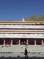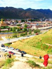 拉卜楞寺,坐落在甘南夏河县县城境内,海拔约3000米。中国 藏传佛教格鲁派六大寺庙之一,寺内有医学院等六大学院和18个庙堂。拉卜楞寺景区外围建设了大量的转经筒环绕景区一周,无数虔诚的信徒和旅游者在转着转经筒。景区周边有停车场,四周都是山,覆盖着或多或少的植被、树木。一个藏传佛教信徒的心灵家园。