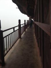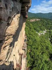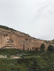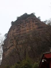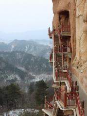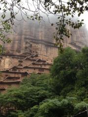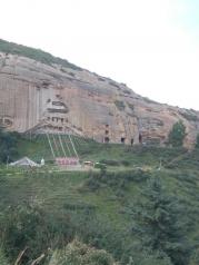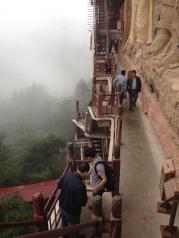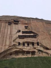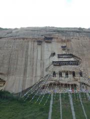 麦积山石窟——四大名窟之一 拥有其他石窟所没有的栈道 高空的楼梯走起来让人也是觉得比较有意思的 从下面往上看的时候也是很壮观 我们今天去的时候 有点小雨 起雾了 不然远眺青山一定更加美丽 上到石窟需要70元 不上就是20 可是要是不上石窟 那20元也没有必要出了