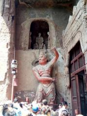 莫高窟——我们定的上午10点45的票,先到数字中心看介绍敦煌历史的两场电影,时长半个小时左右吧,特效还是很不错的,值得一看。完后坐旅游车到莫高窟,大概20分钟左右,进入景区后有专门导游组织,20人一队每人分配一无线电耳机然后就进洞窟,大概参观了有7个洞窟。现在属于旅游旺季,游客比较多,每个窟内有三四个导游都是流水线参观,还没来得及仔细看壁画就得去下一个景点,,建议来之前先在网上了解一下莫高窟的几个著名洞窟以及壁画上的佛教故事。。。