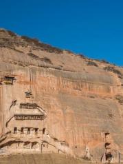 麦积山石窟不是很大,但颜色偏暗红,形状象麦堆,真的很个性,山下仰望,峭壁上开凿了无数的窟,有大有小,栈道直接建在悬崖上,缓缓向上,很古朴的样子,估计以前的路要比这难走的多.悬崖上有很多不规则的窟窿,都是当年建造石窟是工匠用来安装爬高的支撑物的.石窟始于后秦,历经北魏、西魏、北周、隋、唐、五代、宋、元、明、清历代都不断地开凿和修缮,现存造像中以北朝造像原作居多。