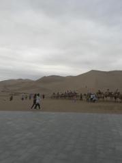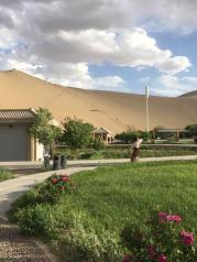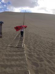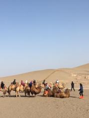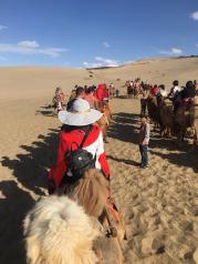 我感觉鸣沙山是敦煌最好玩的景区。我们是下午四五点进景区的,不要大中午的去,会被晒死而且人很少不好玩。在进去之前在外面买了墨镜,帽子和口罩,墨镜可以凹造型,帽子防晒,口罩防风沙防晒。最好之前就准备好,景区外面的店很坑,东西质量不好还贵!防沙鞋套建议不租,我是鞋子进了沙就脱掉倒一倒,而且爬沙山的时候很多人就是脱了鞋爬的,我们也是赤脚爬的,根本不需要鞋套。即使是滑沙,我们也没穿鞋套,土豪随意。然后说说项目,我们骑了骆驼100一人,骑一大圈,最后送到月牙泉附近,刚坐上去的时候有点害怕,慢慢的就好了。骑到山顶会下来休息,这时候可以去滑沙,木板的那种15每人,如果要租鞋套还要15,我没租鞋套。爬上那个山顶