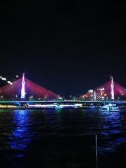 春节假期,珠江夜游怎么错过。查攻略,有多个码头有珠江夜游服务,团购离宾馆近、方便的西提码头,团购窗口取票非常方便。夜色中珠江两岸灯光璀璨,白天鹅宾馆、音乐厅、大总统府、珠江新城、“小蛮腰”,目不衔接,最赞的是横跨珠江上的不同时代大桥,风格迥异,如一条条玉带,横枕在珠江之上。温湿的江风吹在脸上,人自醉的感觉。