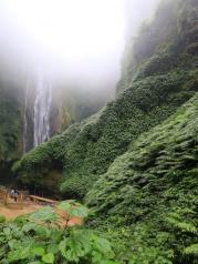 全长2.8公里,由通灵峡、念八峡及地下暗河、隧道贯通连接,沿着阶梯首先来到一个蜿蜒而下的溶洞,然后沿着小河边一直走向尽头,就看到从几十米高空垂落的水流,远看时觉得水量挺少,没有想象的壮观,不过走近后水流声越来越大,水流落下与石壁溅起的水花形成了水雾,像下大雨一样落在通道上,还好都带了伞,。走进峡谷下面的山里,有一些钟乳石和悬棺洞葬,不过没有看到悬棺,自然风景还是值得一看。
