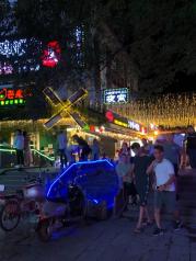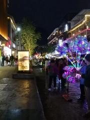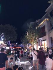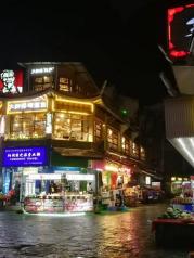 晚上的阳朔西街是非常的热闹,我去的时候也是晚上,灯火通明,街道两边有不同的商铺。在西街最出名的就莫过于啤酒鱼,很多刘大姐,王大姐的店面很多。远处是桂林的山水,非常漂亮。