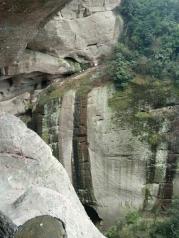 登上八角寨不足两平方米的观景台,放目远眺:一边是湖南新宁丹霞群,一边是广西资源的丹霞山峰群;伸向八方的八个山峰有六个山峰在湖南,两个在广西。长达十余公里幽深莫测的峡谷中,构成一座天然的艺术长廊。