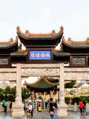 黔灵山公园就在市内,交通很方便。公园门票5元,性价比高。 坐公交车到公园南门。从车站到南门的路两边,都是各种小吃店、特产店,非常热闹。 我们的路线是,从南门进,上山至弘福寺,再从另一侧下山。