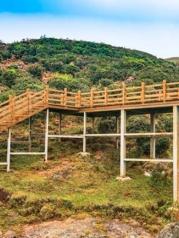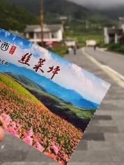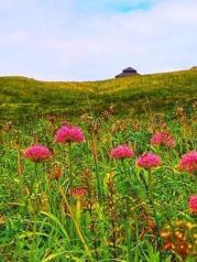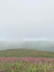 大韭菜坪景区有2个大门,我们是沿路一直往山上开,到达停车场,是东门。门票25元,广东籍全免。为了保护野生韭菜花,进景区必须乘坐索道或观光车,今次行程我们坐索道上,观光车下。只需花点银子,便能免去跋山涉水之劳,不费吹灰之力凌驾于这天上花海。我喜欢这样的旅游!我们选择了乘坐索道上山,山脚到山顶的高差是400米左右,大概需要20分钟就能上到“天上花海”。韭菜坪上气象变幻多端,景色也瞬息万变。时而,视野开阔,一览众山;时而,云雾飘渺,如仙境般。山顶的草坪区域里,修了很多架空的木制步道,以保护草坪。对面山坡上懒洋洋转动着的大风车和这满山花海真是绝配,不经意间这些风车很自然地就融入到眼前的美景中,成为不可