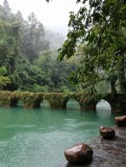贵州荔波小七孔值得一游,景色宜人,山清水秀的好地方,古桥边小歇会儿,非常养眼的地方,这里的水是绿色的,很清澈的可以看到水里面游的鱼,遇到水面渔夫踩水表演,非常精彩