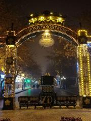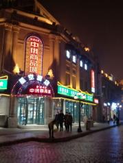 哈尔滨中央大街的尽头是松花江,此时已经结冰的江面上有很多顾不上天寒地冻人们在嬉戏,对南方人来说甚是稀罕。大街的白天和晚上,更喜欢的是华灯初放的晚上,有许多俄式风格的建筑在灯光的照射下恍若处在异国他乡的街道上。