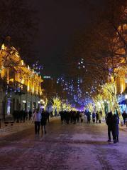 哈尔滨中央大街光彩夺目的感觉,大街上各种各样的建设物都有其独特风格,搭配灯光效果更加迷人。天气冷得发抖,吃冰棍的人却络逸不绝!如果能再加些遍地白雪覆盖就更加美腻啦!